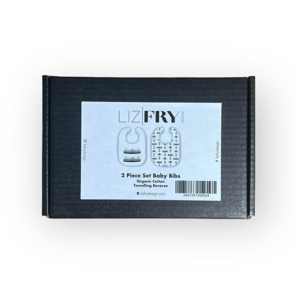 Each set includes two reversible cotton bibs featuring Liz Fry’s signature Hong Kong prints: